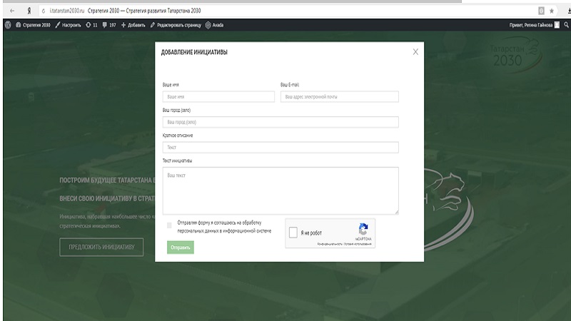 2. В появившемся окне необходимо заполнить все данные, в том числе «Ваше имя», «Ваш E-mail», «Ваш город (село)», «Краткое описание инициативы» и «Текст инициативы». Далее необходимо поставить галочку рядом с текстом «Отправляя форму я соглашаюсь на обработку персональных данных в информационной системе», а также поставить галочку рядом с текстом «Я не робот» и пройти проверку. После этого необходимо нажать на кнопку «Отправить».