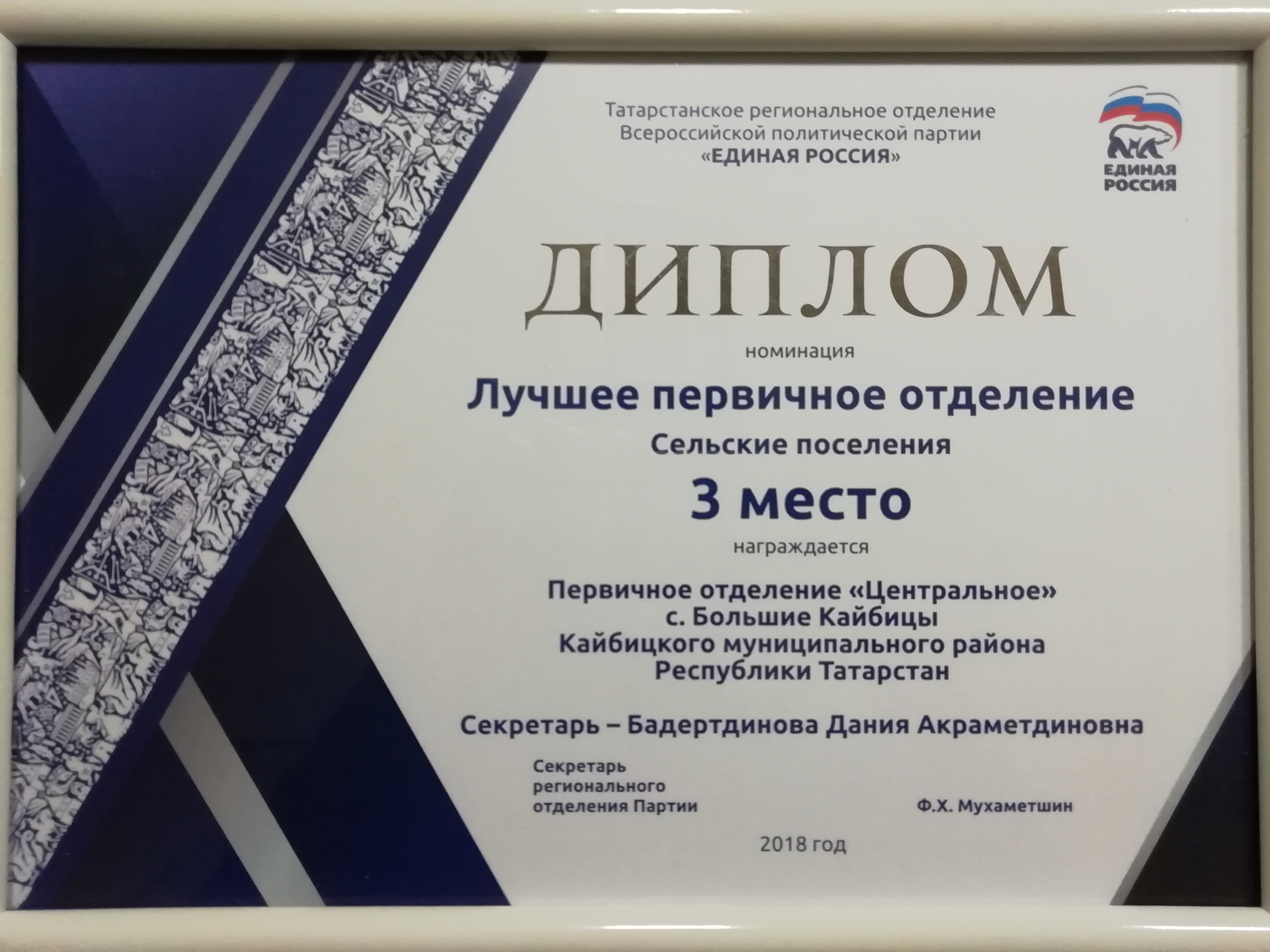 В рамках коференции Председателем Государственного Совета РТ Фаридом Мухаметшином были награждены победители регионального конкурса первичных отделений. Из нашего района 3 место в номинации "Лучшее первичное отделение" среди сельских поселений заняла Секретарь первичного отделения Партии "Центральное", управляющий делами исполнительного комитета района Дания Бадертдинова.