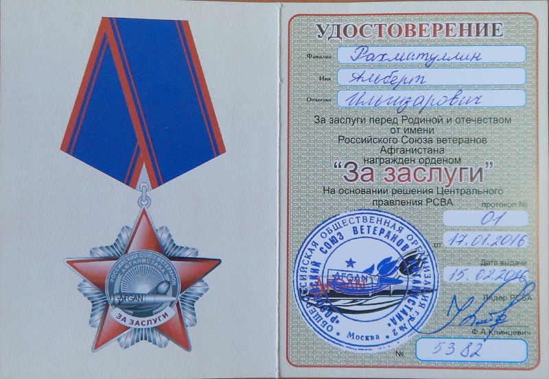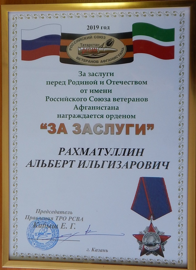 Глава района был награжден орденом за заслуги перед Родиной и Отечеством от имени Российского Союза ветеранов Афганистана. В период работы Альберта Ильгизаровича создан памятник воинам-интернационалистам, были заложены новые традиции в работе с участниками боевых действий.