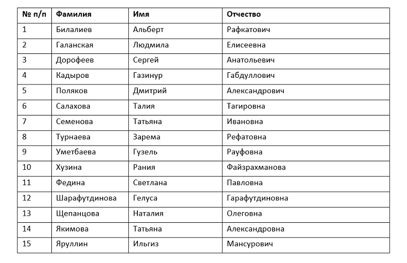 Список кандидатов в присяжные заседатели для обеспечения работы Центрального окружного военного суда от Кайбицкого муниципального района Республики Татарстан на период с 1 июля 2019 года по 30 июня 2023 года
