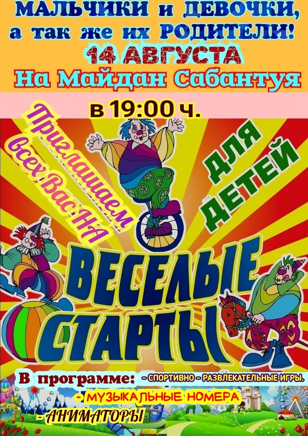 14 августа в 19.00 на майдане Сабантуя состоятся «Веселые старты» для детей и подростков. В программе мероприятия: спортивно-развлекательные игры, аниматоры. Активных участников спортивно-развлекательных игр ждут призы!