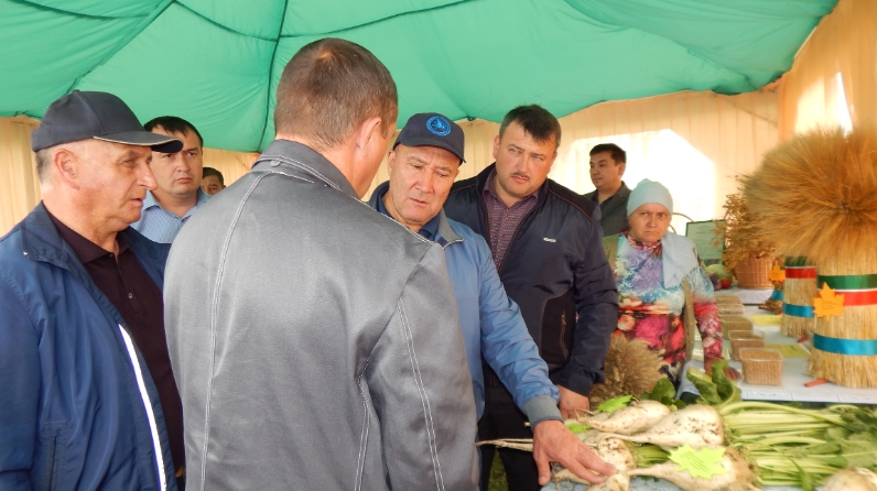 После осмотра полей Марат Готович встретился с руководителями хозяйств, главами сельских поселений, агрономами и представителями крестьянско-фермерских хозяйств района. Встреча состоялась на поле агрофирмы "Кубня". Здесь же была развернута небольшая выставка продукции предприятий района. На выставке были представлены продукции потребительского кооператива "Юлдуз", потребительского кооператива "Союз Агро", общества "СЛ-Молоко", а так же общества "СЛ-Агро".