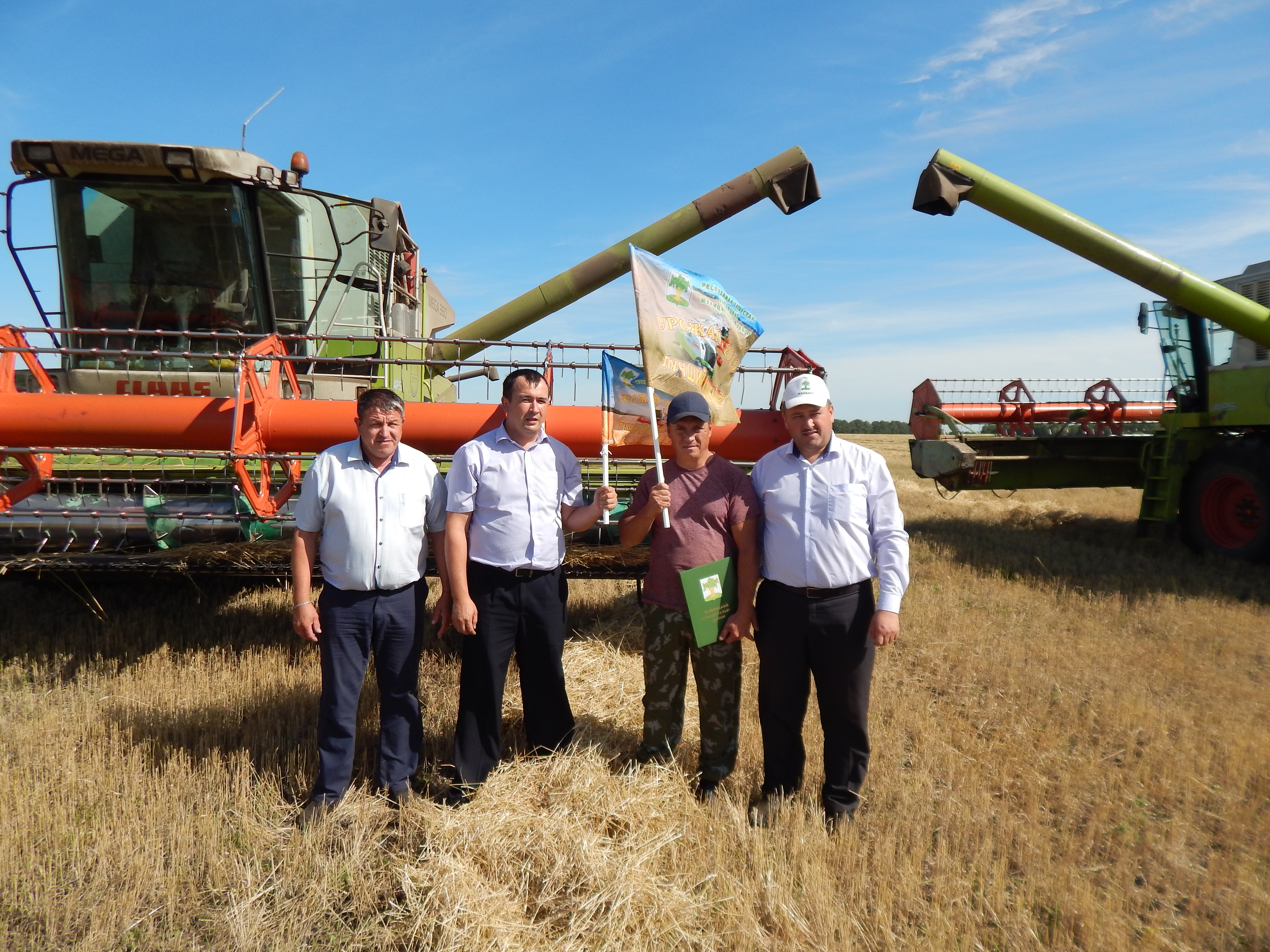 На поле яровой пшеницы вблизи села Большое Тябердино, 23 августа 2019 года (на фото справа-налево: Глава района Альберт Рахматуллин, механизатор Альберт Лазерев, начальник управления сельского хозяйства и продовольствия Радик Камалетдинов, руководитель хозяйства агрофирмы "Кубня" Валерий Поляков)