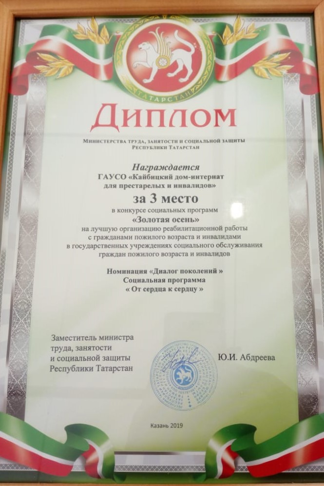 В конкурсе наш район представлял Кайбицкий дом-интернат для престарелых и инвалидов села Федоровское, который занял 3 место в номинации "Диалог поколений" с социальной программой "От сердца к сердцу". Программа была направлена на лучшую организацию реабилитационной работы с гражданами пожилого возраста и инвалидами в гос.учреждениях социального обслуживания. Мы их поздравляем!
