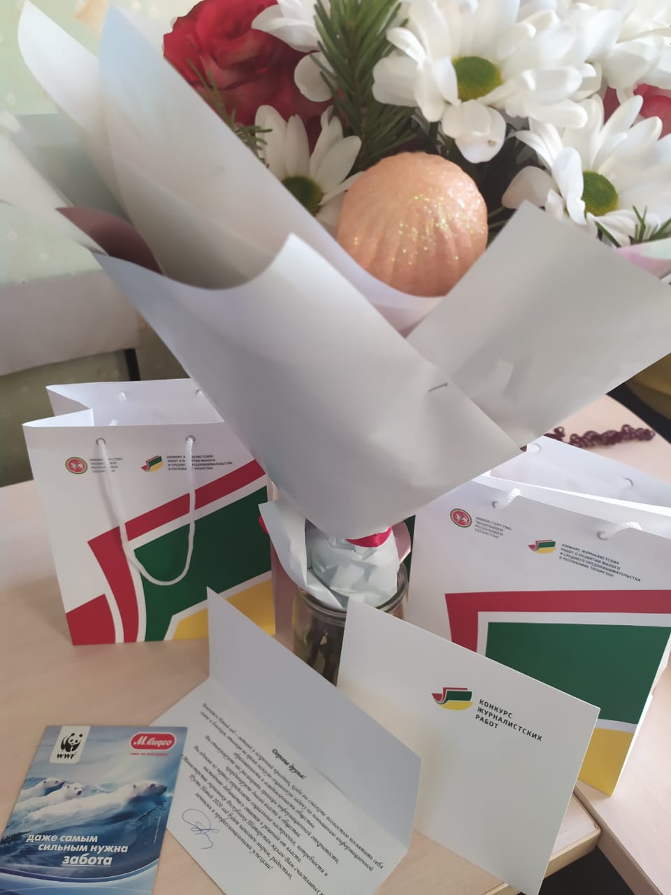 Три журналиста газеты "Кайбыч таннары" - Мингазиз Сунгатуллин, Людмила Путятинская и Фирада Сайранова в канун новогоднего праздника принимали подарочные сертификаты и поздравления от министра экономики Республики Татарстан Фарида Абдулганиева за профессиональное мастерство и лучшее освещение темы предпринимательства в средствах массовой информации республики.