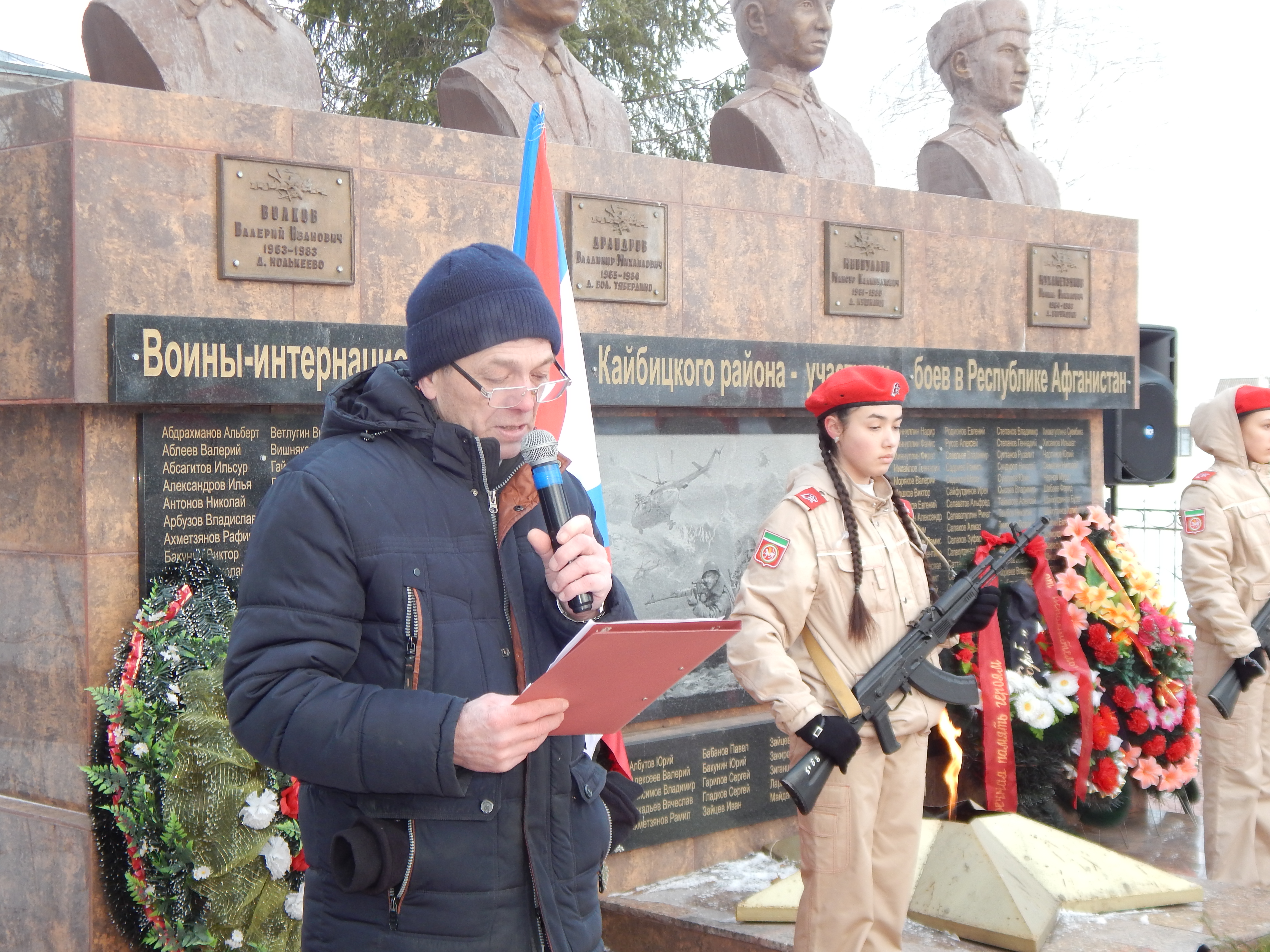 "Выполняя указы Правительства Советского Союза и Министерства обороны, молодые ребята из Кайбицкого района - 181 человек, оказались на территории демократической Республики Афганистан. Афганская война была длительной и продолжительной по своим масштабам. В этой длительной войне и мы приняли участие. В то далекое время многие из нас мальчишками наулись смотреть смерти в лицо, терять в бою своих близких товарищей и друзей, но несмотря ни на что мы до конца были преданы военной присяге. Война в Афганистане показала, что мы достойны своих отцов и дедов, победивших фашизм в годы Великой Отечественной войны. Нам ветеранам боевых действий нельзя забывать наших родителей и матерей за воспитание прекрасных сыновей Отечества. Это Валерий Волков из Молькеева, Владимир Драндров из Большого Тябердина, Мансур Миннуллин из Кушман, Рамиль Мухаметзянов из Бурундуов. Они всегда будут в нашей памяти и в наших сердцах", - поделился ветеран афганской войны Хамит Гибадуллин. Он поздравил всех ветеранов боевых действий с праздником, а так же поблагодарил администрацию района за организацию митинга.