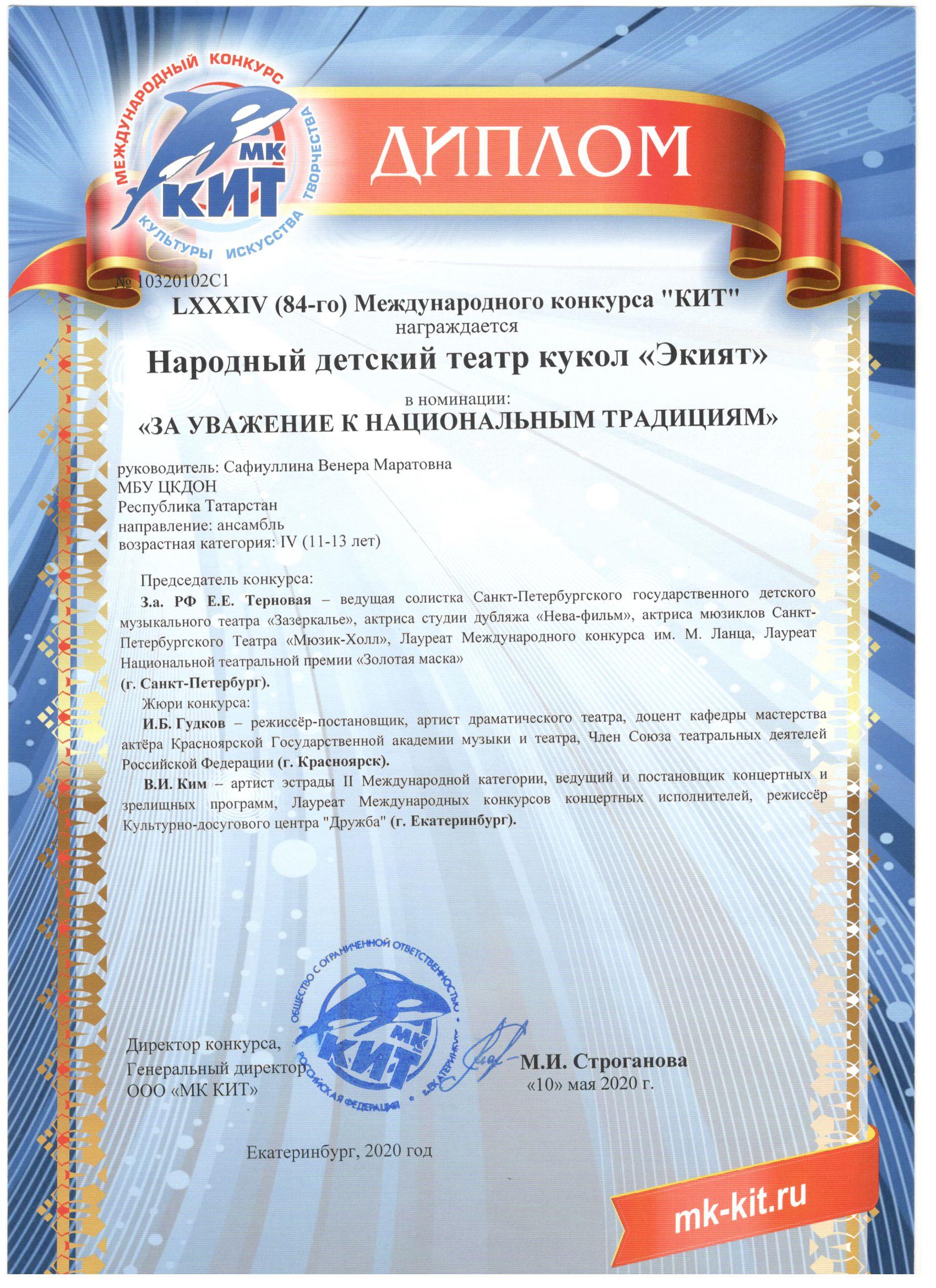 По итогам конкурса народный детский театр кукол «Экият» был удостоен Диплома Лауреата 3 степени Международного конкурса «КИТ». Также театр кукол был отмечен Дипломом в номинации «За уважение к национальным традициям».