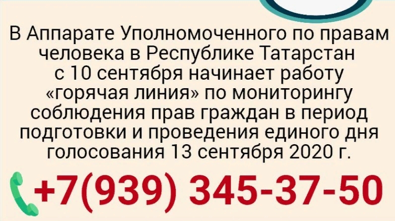 В Аппарате Уполномоченного по правам человека в Республике Татарстан с 10 сентября 2020 года начинает работу «горячая линия» по мониторингу соблюдения прав граждан в период подготовки и проведения единого дня голосования 13 сентября 2020 г.