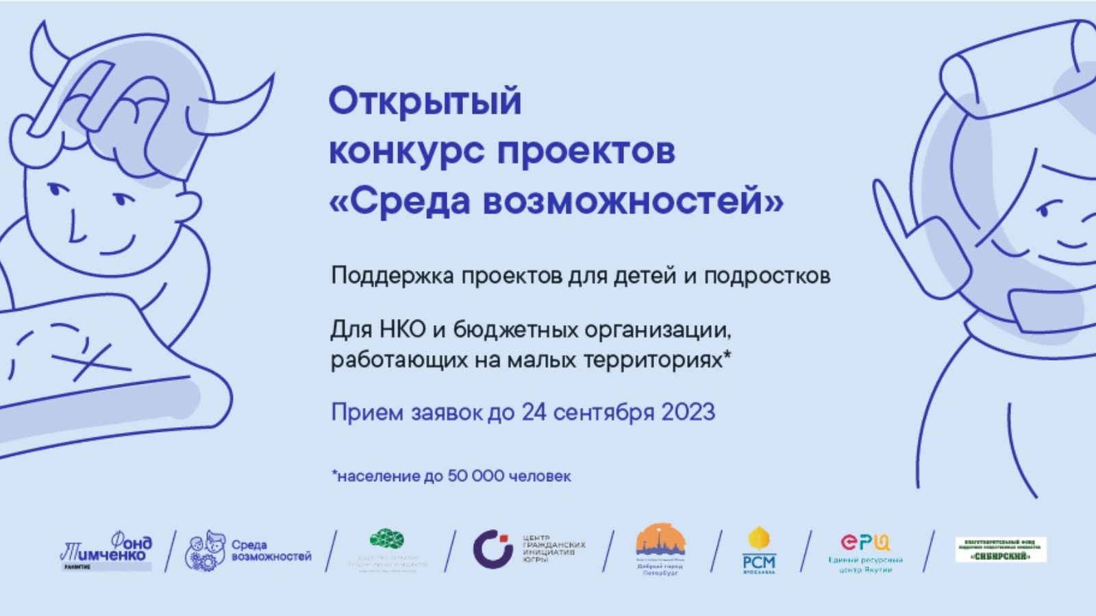 Благотворительным Фондом Тимченко объявлен старт конкурса проектов «Среда возможностей» (далее –Конкурс) по созданию поддерживающей и развивающей среды для детей и подростков. Принять участие в Конкурсе могут некоммерческие организации и бюджетные учреждения из населенных пунктов с численностью населения до 50000 человек. Победители получат целевую финансовую поддержку на развитие и масштабирование проекта в размере до 1000000 рублей, а также экспертное сопровождение специалистами конкурса.