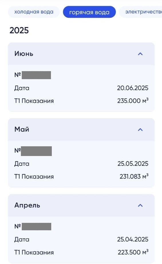 Если вы передавали показания счётчиков несколько дней назад иным способом, не через приложение, они могут в приложении пока не отобразиться.