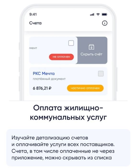 Любой счёт, который вы уже оплатили или будете оплачивать через другой сервис, можно скрыть. Проведите по нему пальцем влево, и он будет перенесён в раздел «Скрытые счета».