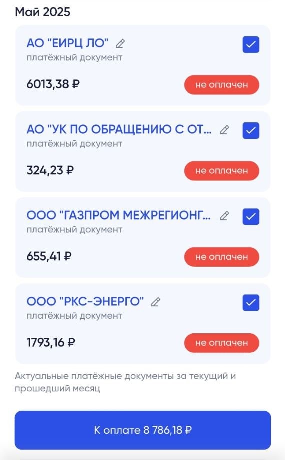 Вы можете оплачивать каждый счёт в отдельности или проставить галочки и оплатить все счета разом.