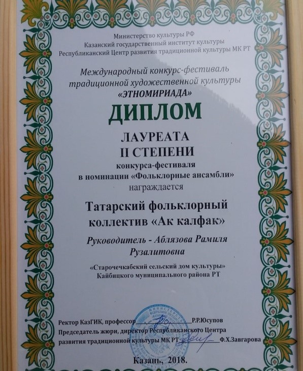 Бәйгедә Иске Чәчкаб авылы мәдәният йортыннан "Ак калфак" фольклор коллективы (Кайбыч муниципаль районы башкарма комитетының мәдәният бүлеге җитәкчесе Рамилә Әбләзова) катнашты. Коллектив II дәрәҗә лауреаты булды.