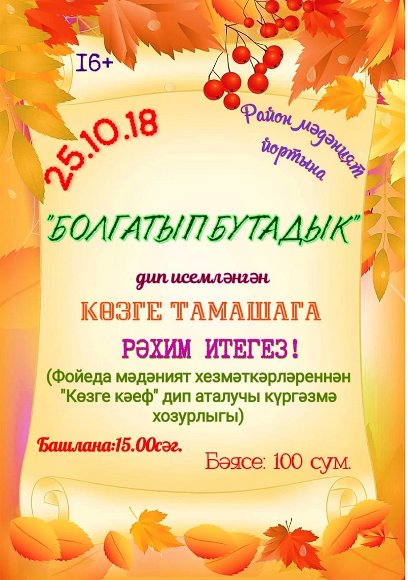 25 нче октябрь көнне 15.00 сәгатьтә Кайбыч мәдәният йортында «Болгатып бутадык» дип исемләнгән көзге тамаша тәкъдим ителә. Шулай ук фойеда мәдәният хезмәткәрләренең “Көзге кәеф” дип исемләнгән күргәзмәләрен дә күрә аласыз. Керү 100 сум. Рәхим итегез!