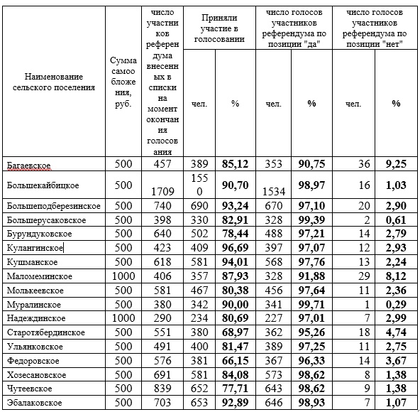 2018 елның 18 ноябрендә Кайбыч муниципаль районы авыл җирлекләрендә гражданнарның үзара салым мәсьәләләре буенча җирле референдумнар оешкан төстә һәм актив катнашында узды.