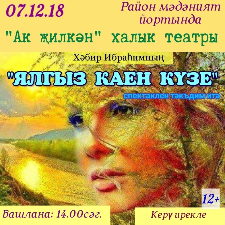 7 нче декабрь көнне,14.00 сәгатьтә мәдәният йортында, инвалидлар декадасы уңаеннан, “Ак җилкән” халык театры артистлары тарафыннан, Хәбир Ибраһим әсәре буенча сәхнәләштерелгән “Ялгыз каен күзе” (мелодрама) спектакле тәкъдим ителәчәк! Керү ирекле.