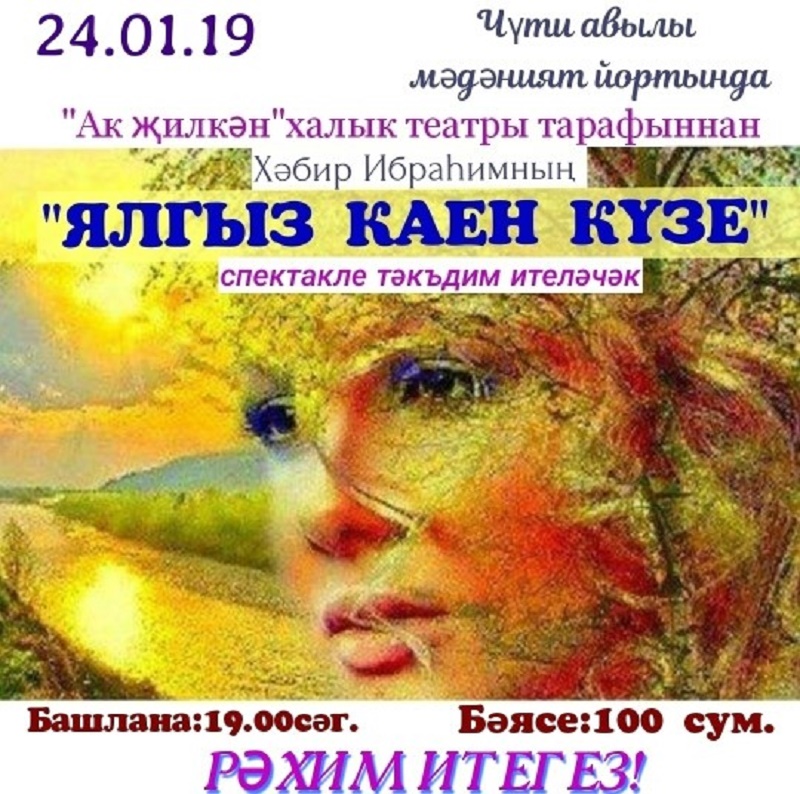 24 нче гыйнвар көнне Чүти авылы мәдәният йортында, Кайбыч районы мәдәният йорты каршында эшләп килүче “Ак җилкән” халык театры артистлары тарафыннан, драматург Хәбир Ибраһим әсәре буенча сәхнәләштерелгән “Ялгыз каен күзе” спектакле тәкъдим ителәчәк. Башлана: 19.00 сәгатьтә. Бәясе: 100 сум.
