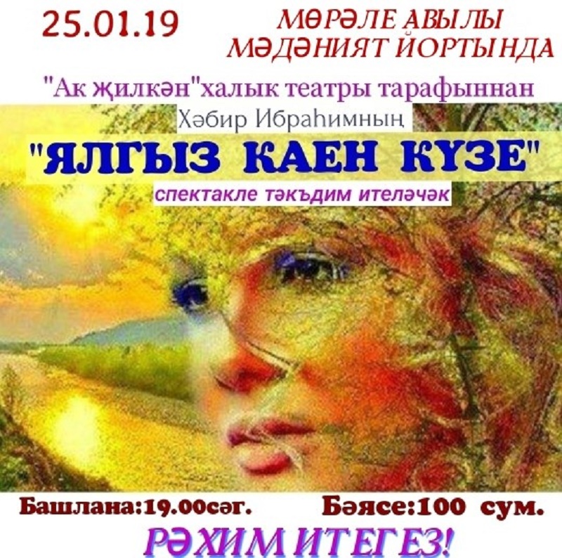 25 нче гыйнвар көнне Мөрәле авылы мәдәният йортында, Кайбыч районы мәдәният йорты каршында эшләп килүче “Ак җилкән” халык театры артистлары тарафыннан, драматург Хәбир Ибраһим әсәре буенча сәхнәләштерелгән “Ялгыз каен күзе” спектакле тәкъдим ителәчәк.Башлана: 19.00 сәгатьтә.Бәясе: 100 сум.