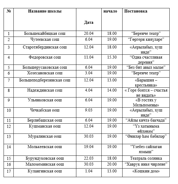 2019 ел Россиядә Театр елы дип игълан ителде. Мәгариф оешмалары педагоглары тарафыннан төрле әсәрләр буенча спектакльләр куела. Спектакльләр авыл мәдәният йортлары сәхнәсендә халыкны чакырып үткәрелә.