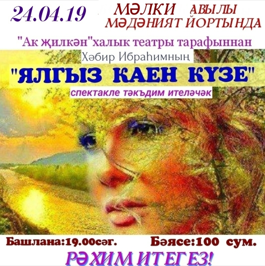 24 нче апрель көнне Мәлки авылы мәдәният йортында Кайбыч районы “Ак җилкән” халык театры коллективы Хәбир Ибраһимның “Ялгыз каен күзе” спектаклен тәкъдим итә. Рәхим итегез! Көтеп калабыз!