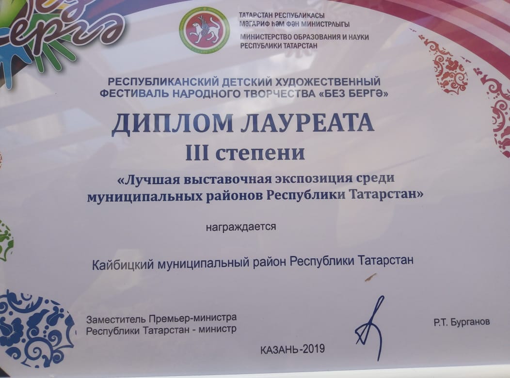 Кайбыч районы "Татарстан Республикасы муниципаль районнары арасында иң яхшы күргәзмә экспозициясе" номинациясендә 3 дәрәҗә лауреат дипломы белән бүләкләнде.