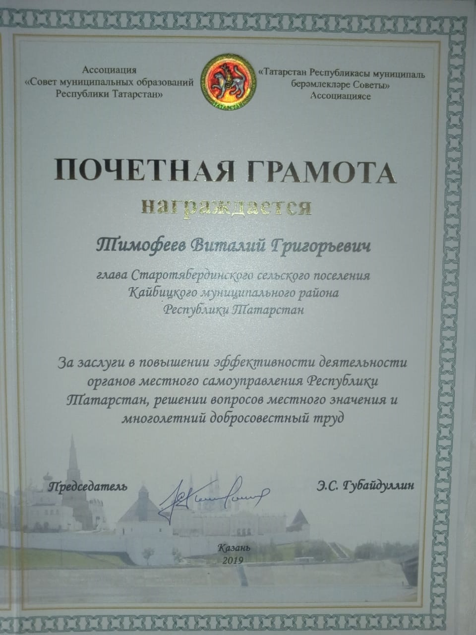 14 майда Чүпрәле муниципаль районында җирле хакимият органнары эшенең актуаль мәсьәләләре буенча зона семинар-киңәшмәсе узды. Аның эшендә төрле министрлыклар һәм ведомстволар вәкилләре катнашты. Чарага Апас, Тәтеш, Буа, Кайбыч, Кама Тамагы һәм Югары Ослан районнарыннан 200гә якын кеше җыелды. Киңәшмәне "Татарстан Республикасы Муниципаль берәмлекләре Советы" Ассоциациясе рәисе Әгъзам Самат улы Гобәйдуллин алып барды. Киңәшмә барышында ул авыл җирлекләре башлыкларына бүләкләр тапшырды, алар арасында Иске Тәрбит авыл җирлеге башлыгы Виталий Тимофеев та бар иде. Ул Татарстан Республикасы җирле үзидарә органнары эшчәнлегенең нәтиҗәлелеген күтәрүдә, җирле әһәмияттәге мәсьәләләрне хәл итүдә һәм күпьеллык намуслы хезмәте өчен Мактау грамотасы белән бүләкләнде.