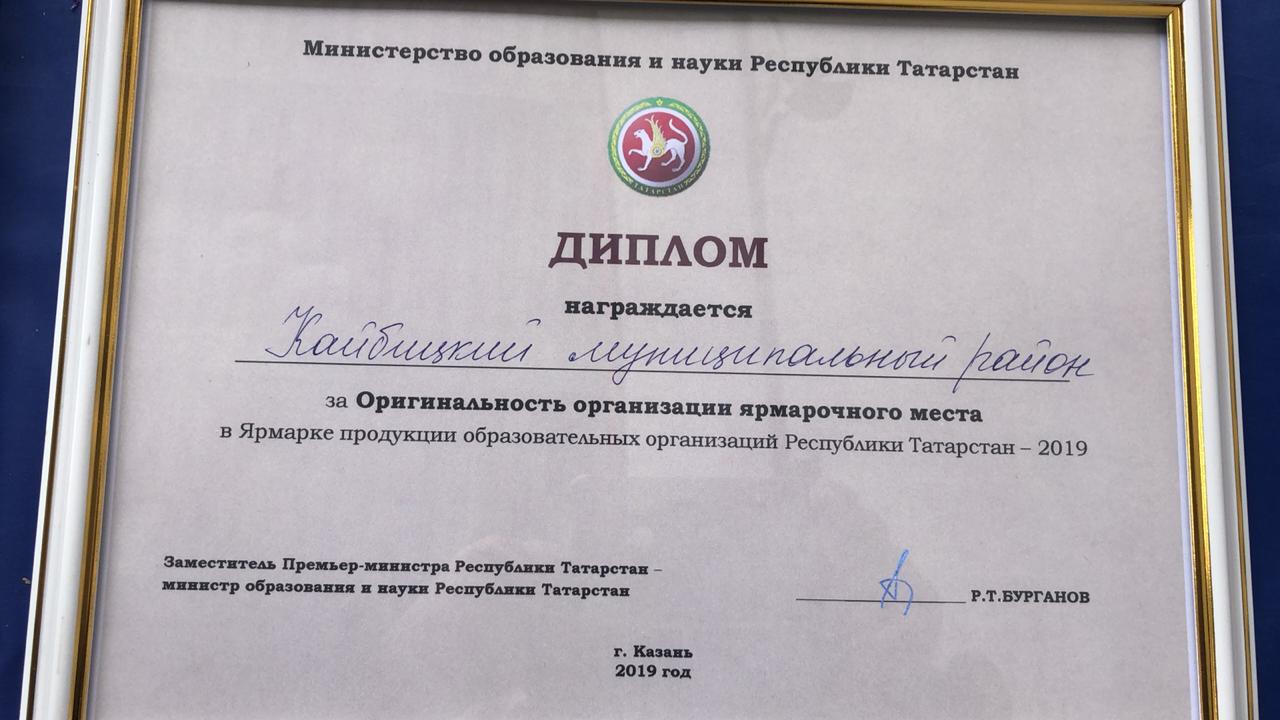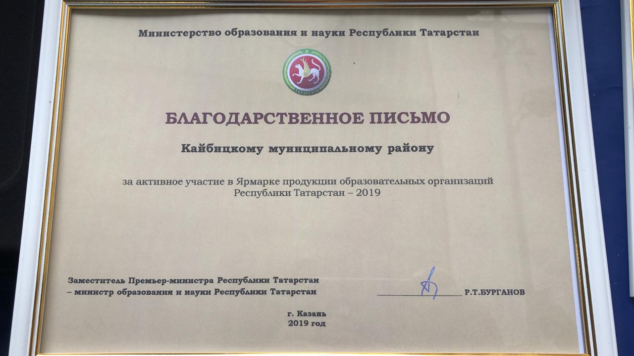 Нәтиҗәдә, Кайбыч районы ярминкә урынын оештыруның үзенчәлеге өчен Татарстан Республикасы Премьер-министры урынбасары-Татарстан Республикасы Мәгариф һәм фән министры Рафис Борһановның дипломына, шулай ук 2019 елгы Татарстан Республикасы мәгариф оешмалары продукциясе ярминкәсендә актив катнашканы өчен Рәхмәт хатына лаек булды.