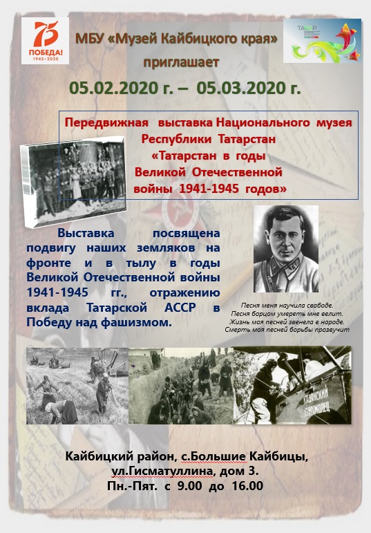 Февраль аенда Кайбыч районына Татарстан Республикасы Милли музееның "1941-45 еллардагы Бөек  Ватан сугышы елларында Татарстан" дигән күчмә күргәзмәсе килә.
