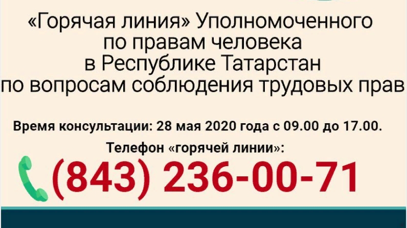2020 елның 28 маенда Татарстан Республикасында кеше хокуклары буенча вәкаләтле вәкил, хокукый ярдәм күрсәтү һәм гражданнарның хокукларын саклауны тәэмин итү максатыннан, республика гражданнарының хезмәт хокукларын яклау мәсьәләләре буенча «кайнар линия» үткәрә.
