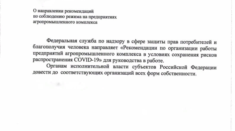 Кулланучылар хокукларын яклау һәм кеше иминлеге өлкәсендә күзәтчелек буенча федераль хезмәт COVID-19 таралу куркынычларын саклау шартларында агросәнәгать комплексы предприятиеләренең эшен оештыру буенча "рекомендацияләр җибәрә :