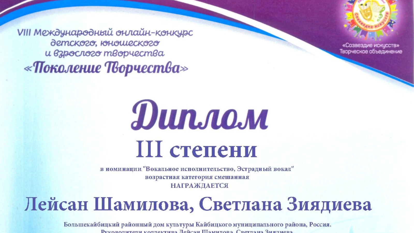 Район мәдәният йортының «Дуслык» халык вокаль ансамбле балалар, яшүсмерләр һәм өлкәннәр иҗатының сигезенче халыкара онлайн – конкурсында катнашты. Халыкара бәйге 12 декабрьдә Екатеринбург шәһәрендә онлайн форматында узды һәм 6 яшьтән өлкәнрәк булган барлык яшь төркемнәрен катнашты.