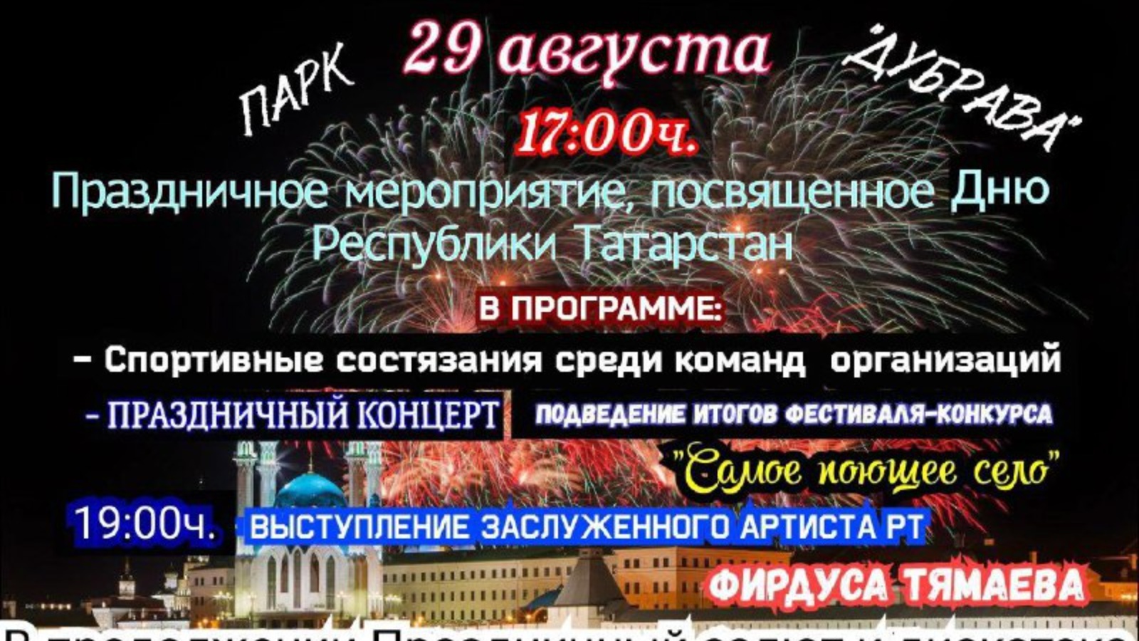 Сезне Татарстан Республикасы көненә багышланган бәйрәм чарасына чакырабыз.