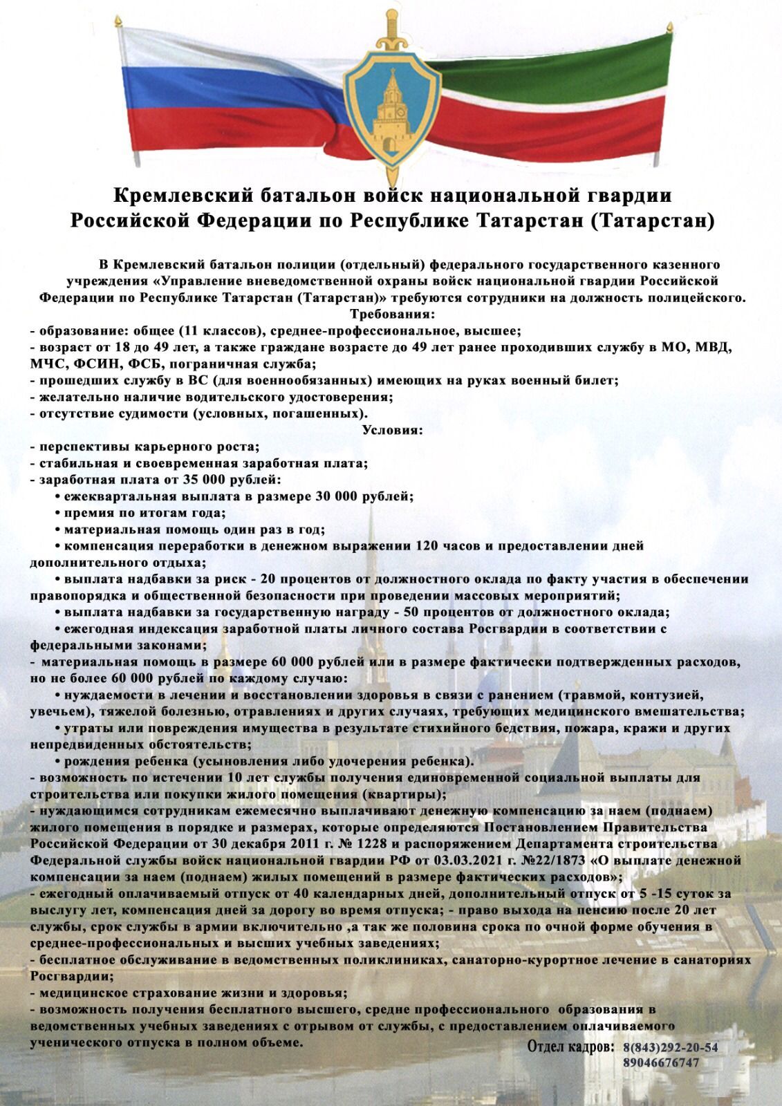 Хәзерге вакытта «Татарстан Республикасы буенча Россия Федерациясе Милли гвардиясе гаскәрләрен ведомстводан тыш саклау идарәсе» Федераль дәүләт казна учреждениесенең Кремль полиция батальоны (аерым) полиция хезмәткәре вазифасында хезмәт итү өчен кандидатлар эзли.