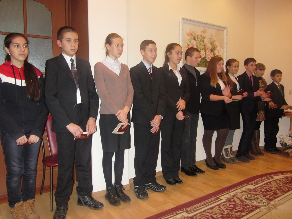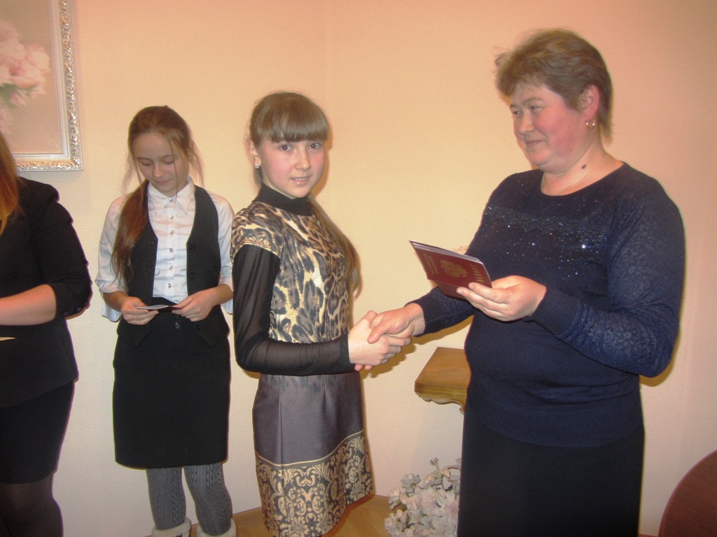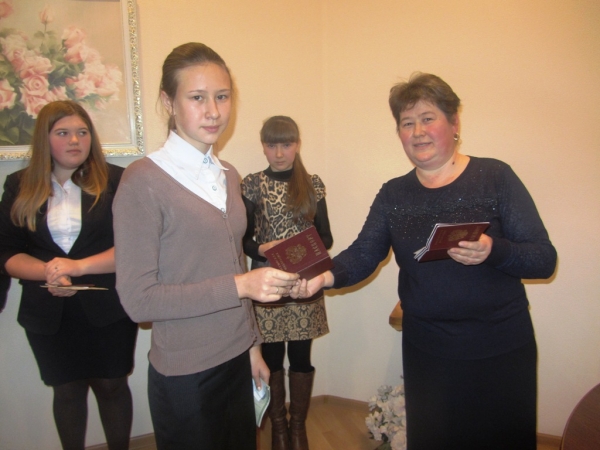 Үсмерләргә Россия Федерациясе граҗданының иң төп документын ЗАГС бүлегендә миграция хезмәте җитәкчесе Фәния Кәлимуллина тапшырды.